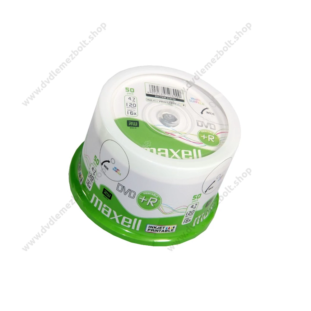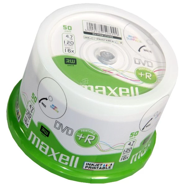 A nyomtatható Maxell DVD+R optikai lemezek alkalmasak számítógépes adatok, zenék, dokumentumok, nagyfelbontású digitális fényképek és FullHD videók biztonságos tárolására, szállítására és megosztására. A teljes testreszabhatóság érdekében a gyártó egy teljes felületre kiterjedő nyomtatható réteget hozott létre az adathordozó felületén. A nagyfelbontású réteg garantálja, hogy a készített nyomat élénk színű lesz és gyorsan szárad. A 4,7GB kapacitású Maxell DVD+R egyoldalas, egyszer írható lemezek, maximális írási sebességük 16x, ami időt takarít meg a felhasználónak. Az archivált adatok az írás befejezése után már nem módosíthatóak. Az írási folyamat is felgyorsult, mivel a DVD+R szabványnál a rövid előkészítő szakaszt (prewriting process) már nem kell létrehozni, mert gyártáskor kerül a lemezre. A Maxell DVD+R lemezek egyszerű megoldást kínálnak digitális adathalmaz biztonságos mentésére és szállítására. A magas színvonalú alapanyagoknak köszönhetően ezek az optikai lemezek kiválóan ellenállnak az UV-fény káros hatásainak. A csomag tartalma 50db nyomtatható Maxell DVD+R optikai lemez, merevített hengeres tokba csomagolva.